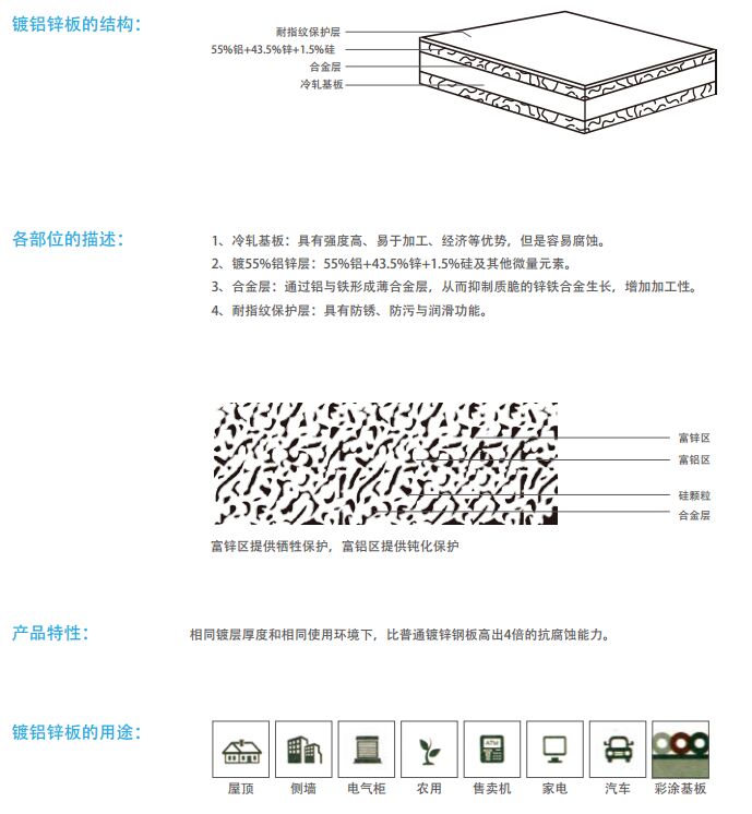 3、鍍層成份按重量比率分別由55%的鋁和43.4%的鋅,1.6%的硅組成。