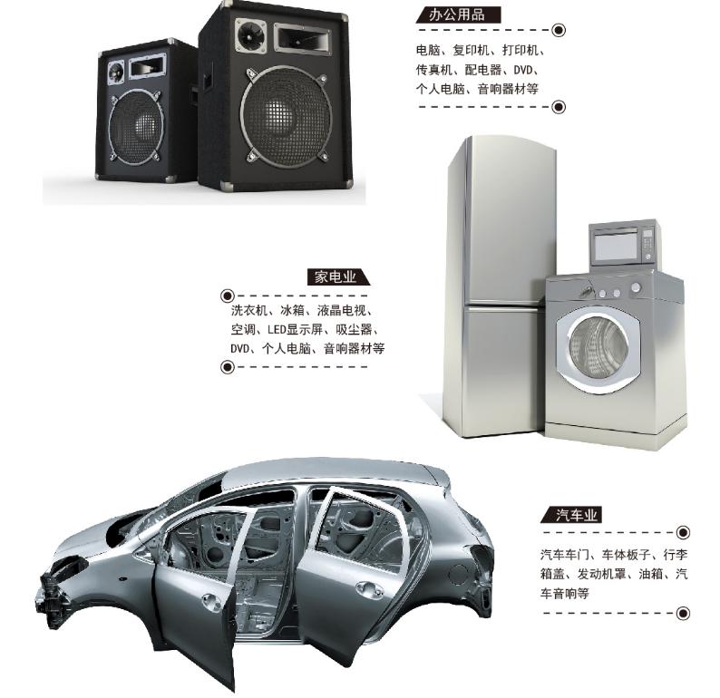 2.家電業(yè):洗衣機(jī),冰箱,電視機(jī),空調(diào),烤箱,通風(fēng)系統(tǒng)外覆蓋件,防爆帶鋼,太陽能熱水器,電器部件等