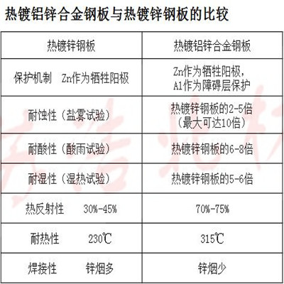 鍍鋅板和鍍鋁鋅板的區別在于鍍層的不同:耐大氣腐蝕性抗高溫氧化性加工性能可焊性涂裝性切口保護性陰極保護作用GI較好較強,鍍鋅層與鍍鋁鋅合金相比,化學性質相對活潑,因此防腐蝕能力差別較大。在同等室外條件下的測試表明,鍍鋁鋅板的使用年限為鍍鋅板的四倍以上。鍍鋁鋅鋼板的鋁鋅合金結構是由55%鋁、43.4%鋅與1.6%硅在600℃高溫下固化而組成,其整個結構由鋁-鐵-硅-鋅,形成致密的四元結晶體,從而形成一層強有效防止腐蝕因子透穿的屏障。