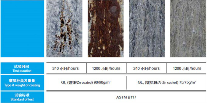 熱鍍鋁鋅鋼板有優異的耐腐蝕性,使用壽命是同等鍍層厚度的普通鍍鋅鋼板的2-6倍。
