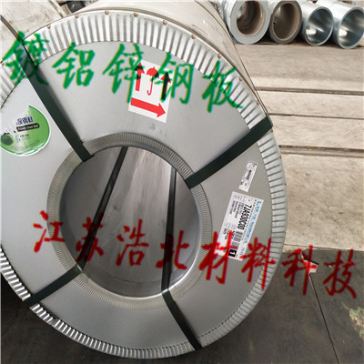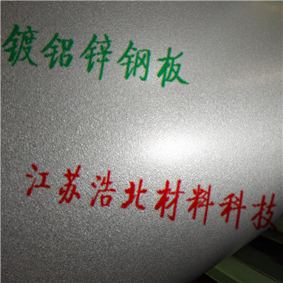 熱鍍鋁鋅鋼板是以各種強度和厚度規格的冷軋鋼板為基材,以雙面熱鍍一層Al-Zn鍍層所得的預鍍層鋼板,鍍層成分中質量百分比為55%Al、43.5%Zn和1.5%Si,融合了Al的物理保護和高耐久性以及Zn的電化學保護特性。此外,在表面呈具有高裝飾性的光亮銀灰色澤及規則的花紋,并具有浮凸感
