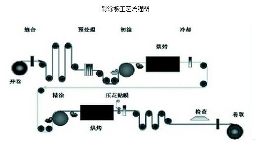常見的二涂二烘型連續彩色涂層機組工藝流程主要生產工序為:開卷→預處理→涂敷→烘烤→后處理→卷取。