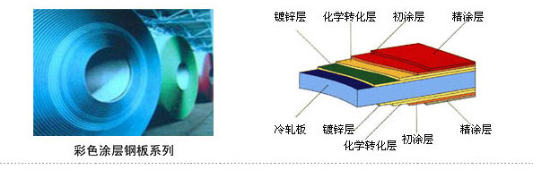 彩色涂層鋼板是以冷軋鋼板和鍍鋅鋼板為基板,經(jīng)過表面預(yù)處理(脫脂、清洗、化學(xué)轉(zhuǎn)化處理),以連續(xù)的方法涂上涂料(輥涂法),經(jīng)過烘烤和冷卻而制成的產(chǎn)品。