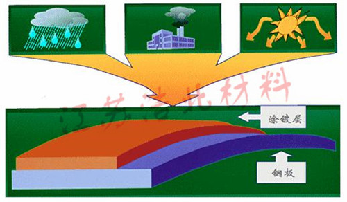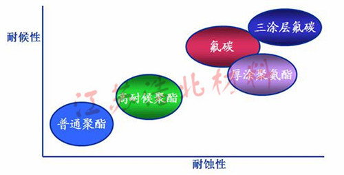 目前用于彩色涂層鋼板的涂料種類有聚酯涂層(PE)、氟碳涂層(PVDF)、硅改性涂層(SMP)、高耐侯涂層(HDP)、丙稀酸涂層、聚氨脂涂層(PU)、塑料溶膠涂層(PVC)等。