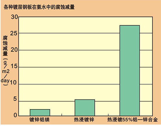 在鹽水噴霧試驗(SST:JIS Z2371)下的紅銹發生時間。鍍鋅鋁鎂鋼板與熱浸鍍鋅鋼板、熱浸鍍鋅—鋁 5% 合金鋼板相比,具有優異的耐紅銹性。鍍鋅鋁鎂鋼板的耐氨性比其他熱浸鍍鋅鋼板和熱浸鍍鋁(55%)-鋅合金鋼板(Galvaster)更優異。