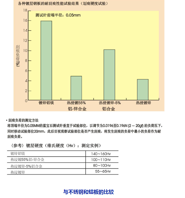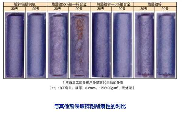 由于鍍鋅鋁鎂鋼板的鍍層比其他熱浸鍍鋅鋼板及熱浸鍍鋅—鋁鋼板更堅硬,具有更優異的耐刮痕性,可適用于加工時易出現刮痕或反復受到摩擦或磨損的部位。