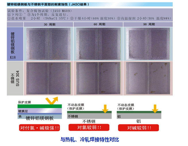 不銹鋼在其表層形成不動態皮膜,具有優異的耐腐蝕性。但缺點是對“鹽”較弱。而鍍鋅鋁鎂鋼板的保護皮膜對“鹽”也可以發揮很強的壁壘效果。“耐穿孔性”等作為結構體使用時所需要的“鋼的壽命”,不銹鋼較為優異。
